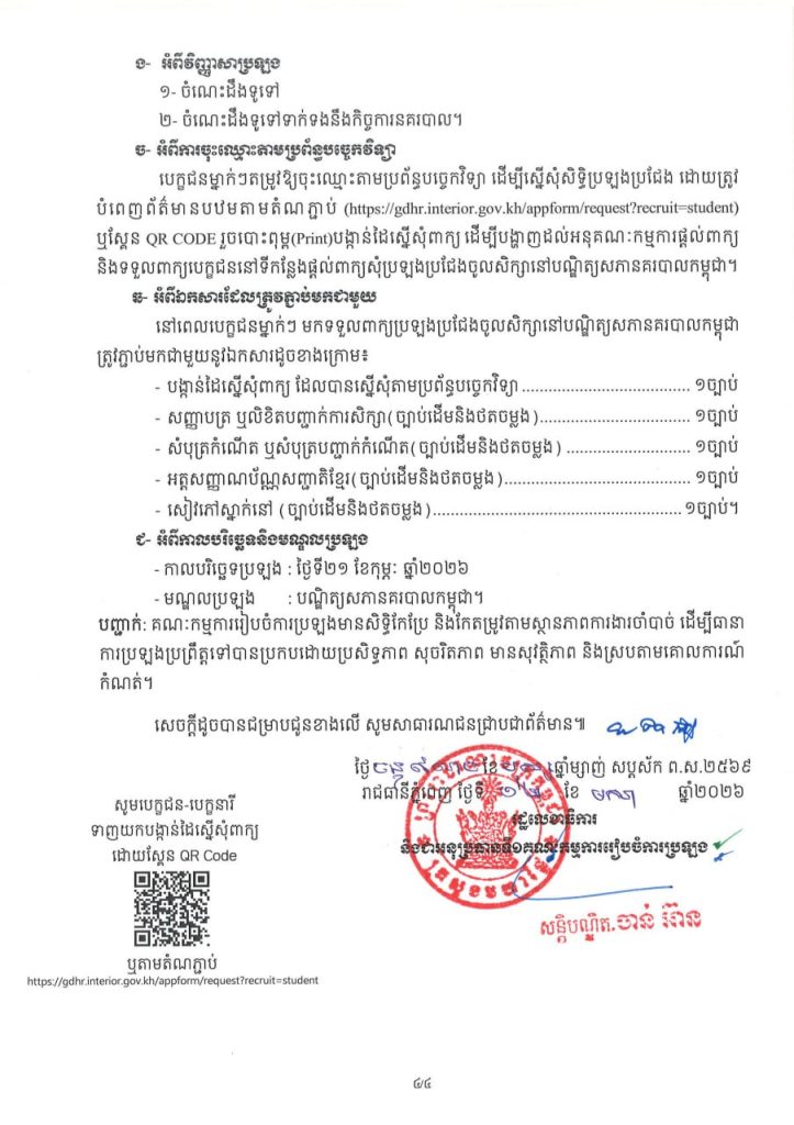 បណ្ឌិត្យសភានគរបាលកម្ពុជា ផ្សព្វផ្សាយបន្តនូវសេចក្តីជូនដំណឹង ស្តីពីការប្រឡងប្រជែងជ្រើសរើសនិស្សិត និងសិស្សនគរបាលអាហារូបករណ៍ប្រចាំឆ្នាំ ឱ្យចូលសិក្សាថ្នាក់បរិញ្ញាបត្រវិទ្យាសាស្ត្រនគរបាល ថ្នាក់សញ្ញាបត្រមធ្យមឯកទេសនគរបាល និងថ្នាក់វិញ្ញាបនបត្រជាន់ខ្ពស់ជំនាញនគរបាល សរុបចំនួន៤០០នាក់៕