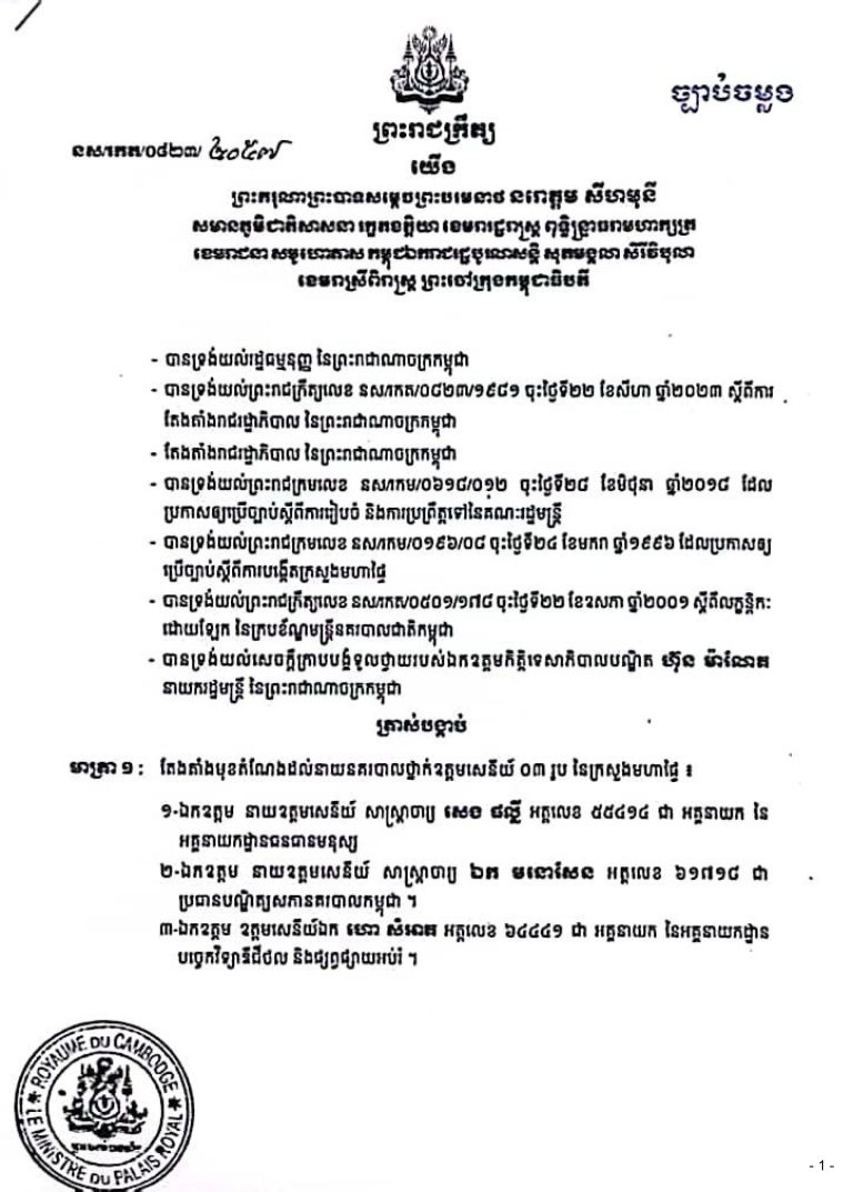 ព្រះរាជក្រឹត្យតែងតាំងមុខតំណែងដល់នាយនគរបាលថ្នាក់ឧត្តមសេនីយ៍ ០៣ រូប នៃក្រសួងមហាផ្ទៃអាន / readព្រះរាជក្រឹត្យតែងតាំងមុខតំណែងដល់នាយនគរបាលថ្នាក់ឧត្តមសេនីយ៍ ០៣ រូប នៃក្រសួងមហាផ្ទៃ