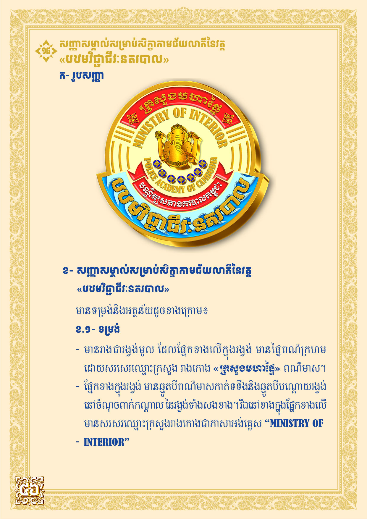 សញ្ញាសម្គាល់សម្រាប់សិក្ខាកាមជ័យលាភីនៃវគ្គ «បឋមវិជ្ជាជីវៈនគរបាល» ចេញផ្សាយដោយ៖ បណ្ឌិត្យសភានគរបាល កាលបរិច្ឆេទចេញផ្សាយ៖ ២០២៦ ទាញយក បើកមើល សញ្ញាសម្គាល់សម្រាប់សិក្ខាកាមជ័យលាភីនៃវគ្គ «បឋមវិជ្ជាជីវៈនគរបាល» ឯកសារពាក់ព័ន្ធ ឯកសណ្ឋាន ស្លាកសញ្ញា និងសញ្ញាសក្តិ មន្ត្រីពន្ធនាគារ February 25, 2026 ប្រកាស ស្តីពី ការកំណត់រូបភាព របៀបប្រើប្រាស់ និងរបបផ្គត់ផ្គង់ ឯកសណ្ឋាន ស្លាកសញ្ញាសញ្ញាសក្តិនិងសម្ភារប្រើប្រាស់ផ្សេងៗ របស់មន្ត្រីពន្ធនាគារ February 25, 2026 អនុក្រឹត្យ ស្តីពី ឯកសណ្ឋាន ស្លាកសញ្ញា និងសញ្ញាសក្តិ មន្ត្រីពន្ធនាគារ February 25, 2026 សៀវភៅគោល ឧក្រិដ្ឋវិទ្យា February 19, 2026 សៀវភៅគោល មូលដ្ឋានគ្រឹះនៃកុំព្យូទ័រ February 19, 2026 សៀវភៅគោល បច្ចេកទេសការពារព្រំដែន February 19, 2026